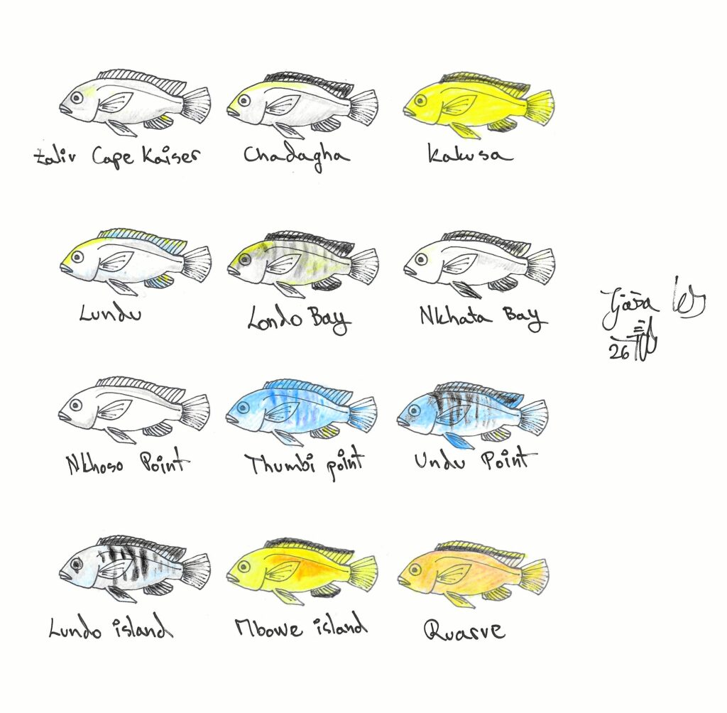 Rumena ustonoša in njene najpogostejše variacije na določenih območjih jezera Malawi.